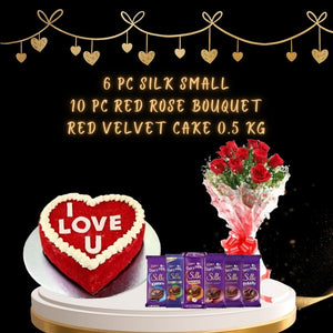 Experience the Eternal Love Velvet Symphony Combo, where passion and sweetness intertwine. The I Love You Red Velvet Delight Cake, a scrumptious expression of love, forms the heart of this ensemble. Accompanied by a luxurious 6 Pc Silk chocolates and a breathtaking 10 Pc Red Rose Bouquet, this combo is a harmonious celebration of eternal love. Elevate your special moments with this grand ensemble, meticulously crafted to create a symphony of emotions.