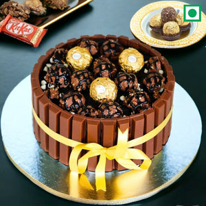 Experience grandeur with our Ferrero Rocher Kitkat Cake. Celebrate birthdays and anniversaries with the opulence of eggless Ferrero Rocher KitKat Cake. Immerse in delightful flavors with Bakebuddy's reliable birthday cake delivery in India. Choose from varied delivery options – free, fixed-time, midnight, and early morning cake delivery. Elevate your moments with the finest – order now and savor the luxury of online cake delivery at its best.