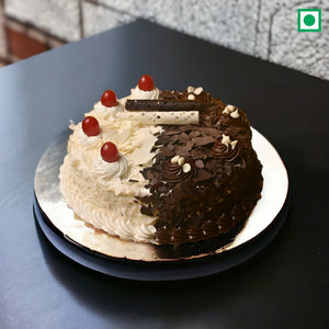 Embark on a journey of taste with our Fusion White-Black Forest Cake, a delightful merger of two classic favorites into one exquisite dessert. This cake presents a striking visual and flavorful balance, layering the light, airy vanilla sponge of the White Forest with the rich, dark chocolate sponge of the Black Forest. Each layer is soaked with its respective cherry and chocolate syrups, creating a moist and tender texture. The cake is frosted with a swirl of luscious whipped cream, combining the tartness of cherries and the bittersweet chocolate shavings in a symphony of contrasts. Perfect for those who love a bit of variety or can't decide between the two, this fusion cake offers the best of both worlds, making every celebration a memorable one.