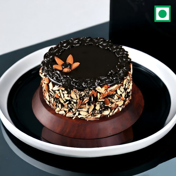 The Premium Choco-Almond Cake is a connoisseur's delight, seamlessly blending the robust flavors of almonds with the richness of chocolate. This cake is a testament to the classic, yet ever-so-elegant combination where every layer is a tribute to the timeless pairing. The moist, chocolate-infused sponge boasts a deep cocoa flavor, providing a soft, sumptuous base that complements the roasted almond pieces scattered throughout. These almonds are handpicked for their superior quality, adding a textural contrast and a nutty nuance that elevates the cake from simply delicious to truly divine. A glossy, smooth chocolate ganache lovingly coats the cake, its sheen as inviting as its taste is irresistible. To finish, a scattering of almond flakes adorns the top, adding a final touch of sophistication. The Premium Choco-Almond Cake is more than just a dessert; it's a celebration of flavor, a luxurious treat that's as perfect for a special occasion as it is for a discerning palate seeking a slice of chocolate-almond heaven.