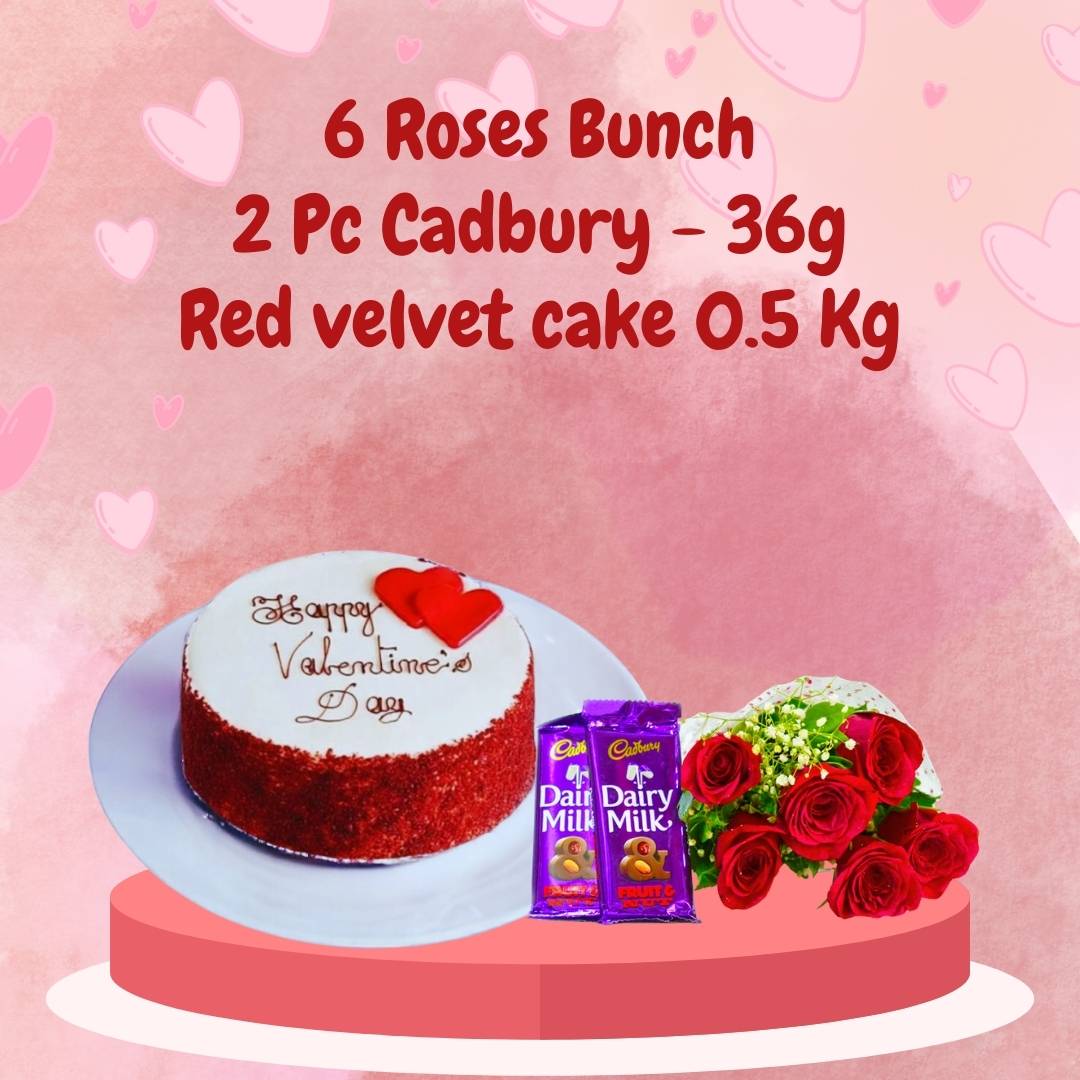 Celebrate love with our Valentine's Day Delight Combo, a perfect combination of sweetness and elegance. The Valentine's Day Cake, a symbol of joy, takes center stage. Paired with a delightful combination of 6 Roses and a small fruit and nut assortment, this combo is exclusively crafted for Valentine's Day. Elevate your celebration with the rich flavors of the cake and the freshness of blooms, creating a moment that captures the essence of love.