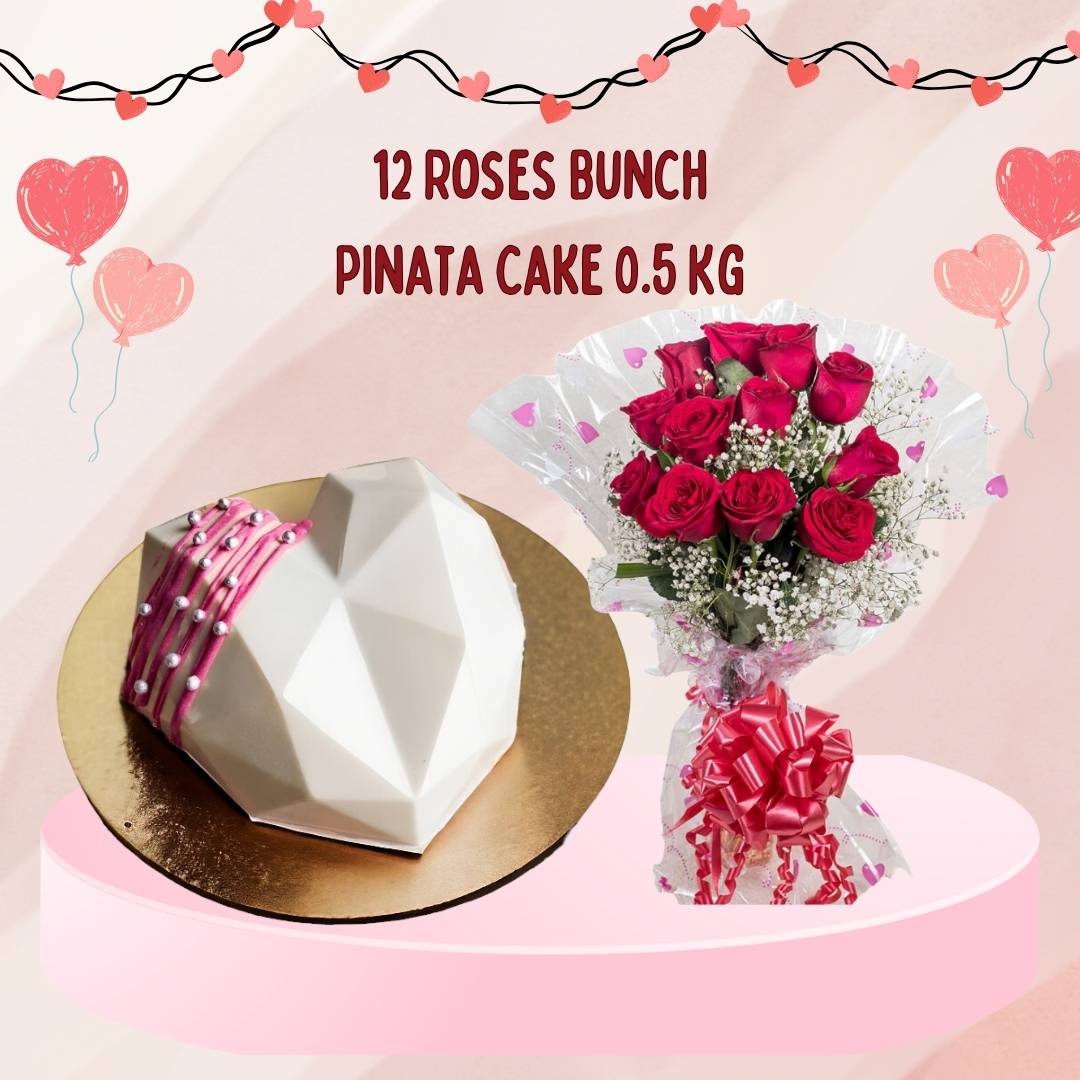 Experience the White Chocolate Rose Symphony Combo, a harmonious celebration for Rose Day. The White Chocolate Pinata Cake, a visually stunning creation, takes center stage. Accompanied by the breathtaking beauty of 12 Roses, this combo is perfect for expressing your love. Elevate your special moments with the richness of white chocolate in the cake and the vibrant beauty of roses, creating a moment of pure love and romance.